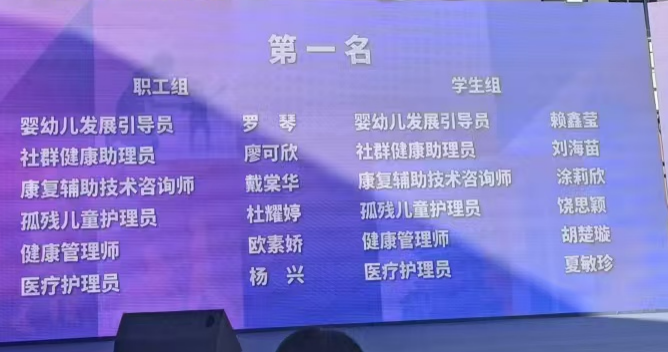 2022级护理学3班胡威同学荣获健康管理师第二名,4班毛雨珊同学荣获社群健康助理员第二名,8班潘英姿同学荣获孤残儿童护理员第二名。